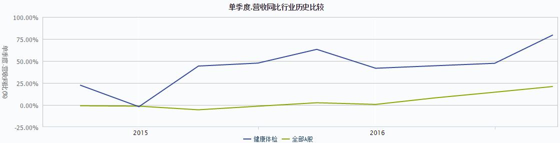 根據(jù)圖1數(shù)據(jù)顯示,從2015年第一季度到2017年第二季度,與全部A股相比,健康體檢行業(yè)的單季度營收同比總體處于較高水平,并表現(xiàn)為波動(dòng)增長的趨勢(shì)。